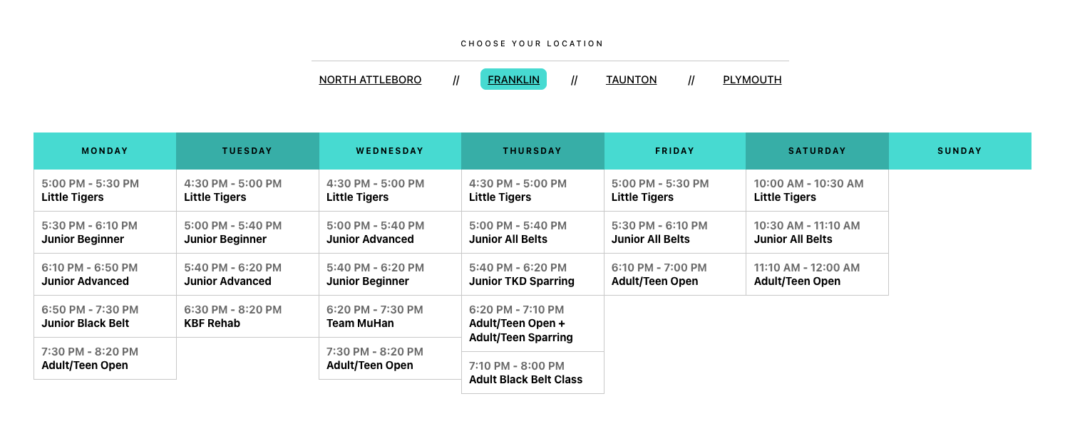 Find the perfect time for your training. Our structured weekly timetable is designed for students of all ages and levels.
